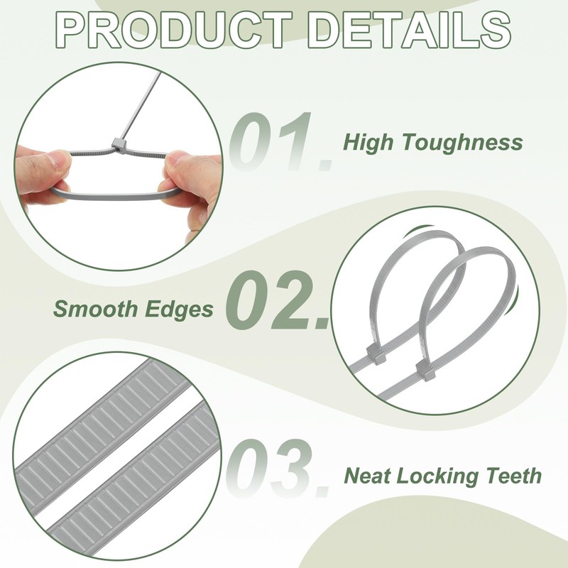 Each zip tie has a durable self-locking mechanism that locks very securely and will not lose over time, and the locking teeth stop the cable tie at the desired length, easy to tie tightly.