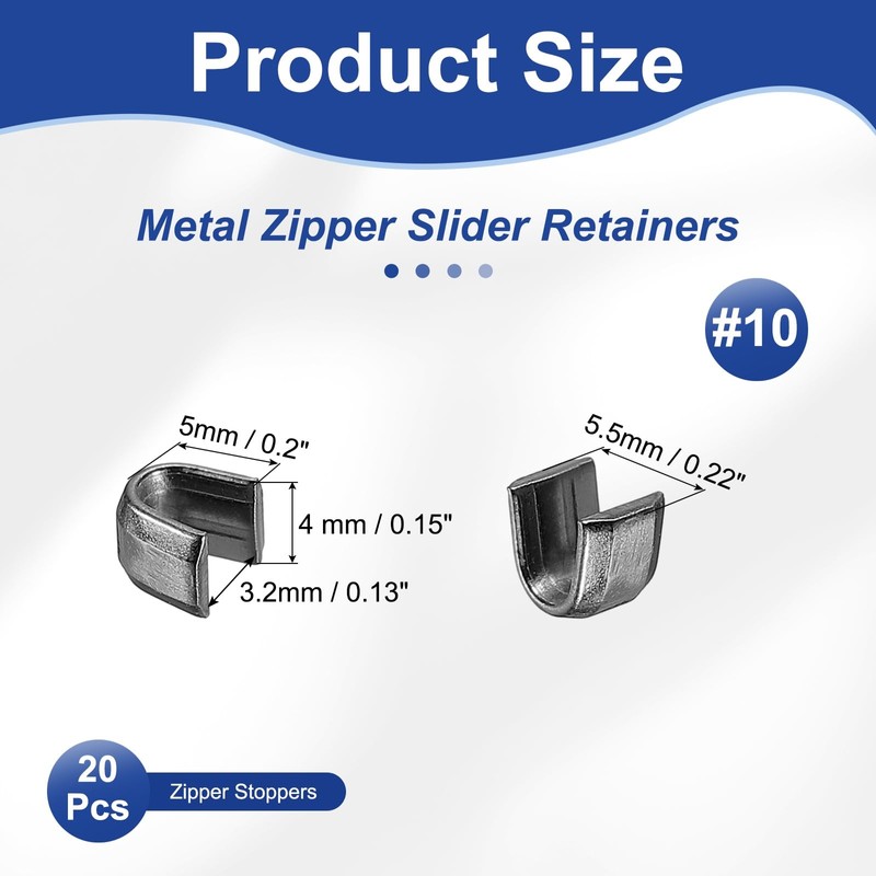- PARCEL CONTENT- Color: Black; Material: Metal; Size: 5 x 4 mm / 0.2 x 0.16 inch (L*H); Wide Opening Size: 3.2 x 5.5 mm/ 0.13 x 0.22 inch (IW*OW); Packing List: 20 Pack x Zipper Stoppers