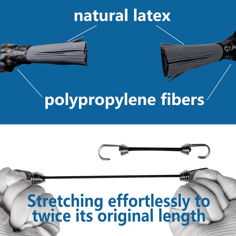 - 【Premium Materials】The bungee cords are woven from natural latex and polypropylene fibers, ensuring a long lifespan and odor-free experience. They can stretch up to twice their length.