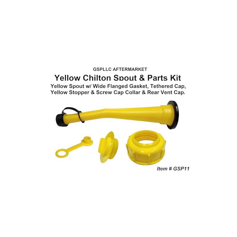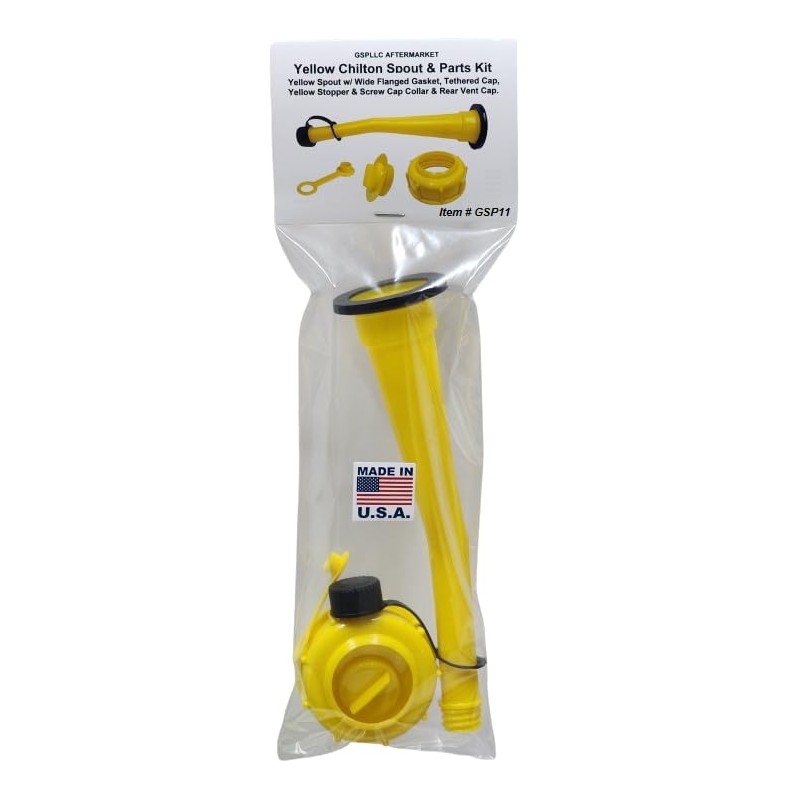 - ✔ Complete Replacement Kit – Includes 8.5" Yellow Angled Spout with U-Seal Gasket, Screw Cap Collar holds and retains spout to can, Rear Vent Cap replica to Original, Stopper Cap fits in base of spout when hiding spout in can for Storage or Transportation.