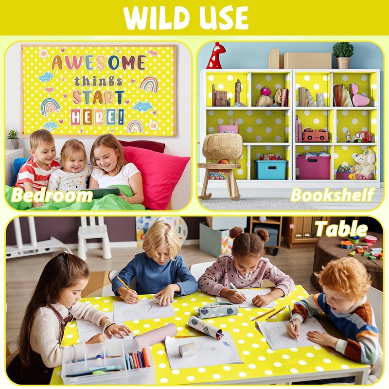 - Ample size: This pack includes an yellow dots roll bulletin board with tape on the back, the packaging of the roll saves you space. Our bulletin board rolls measure approximately 15 inches by 23 feet (40 x 700 cm), providing ample coverage for chalkboards, bulletin boards, and decorations. It can be freely cut to the required length according to needs, convenient DIY decoration, to adapt to different sizes of bulletin boards.