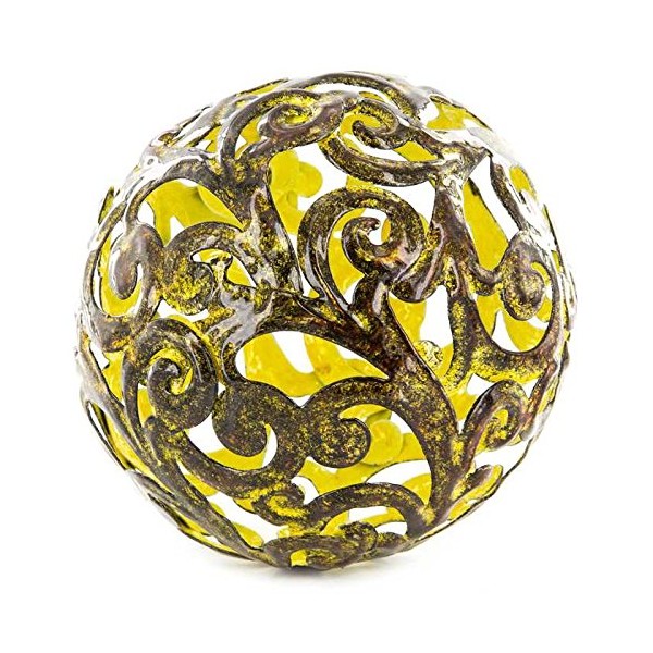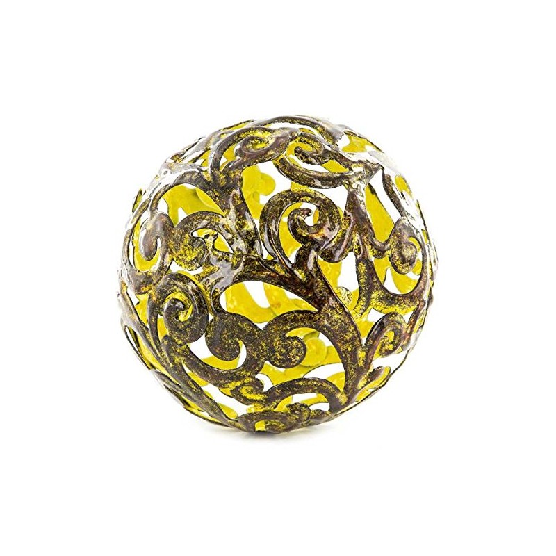 - ''' Featuring a distressed exterior and a yellow interior, this metal sphere is perfect for filling large glass bowls, vases and more#||# Display it in your home for a simple, yet interesting touch#||# Can be used to compliment your current decor scheme or make it the focal point of the room#||# Diameter: 4 inches'''