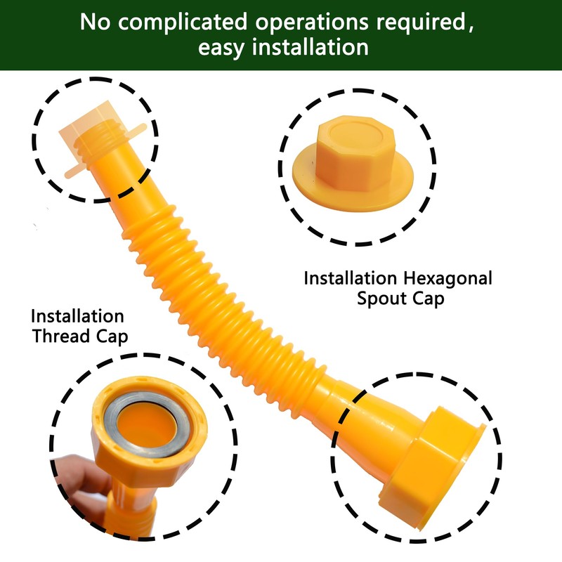 - Innovative No-Spill Design: Our gas tank nozzle features an innovative no-spill design, ensuring a clean and mess-free refueling experience. The threaded gas can spout tubes and caps, along with an internal rubber sealing ring in the cap, create a secure seal. Simply tighten the hexagonal cap post-use, and you can transport your gas can without fear of oil spills