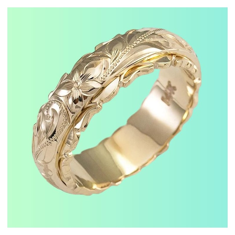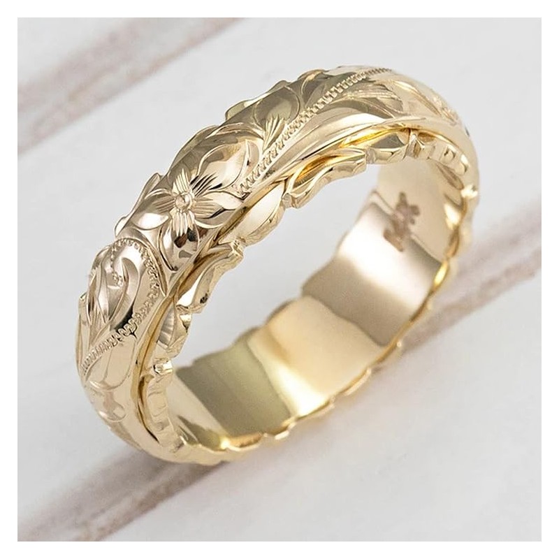 Yellow Gold Plated Floral Stackable Wedding Engagement Band Engraved Rose Flower Ring for Women Hawaiian Scroll Engraved Ring Band (Yellow Gold, Size 7)