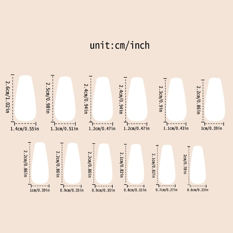 - Package Nails: You'll get 24 false nails in 12 sizes. 1 mini nail file, 1 small wooden stick, 1 piece of adhesive tab glue. You can safely choose a fake nail that fits your finger size and DIY your desired nail shape