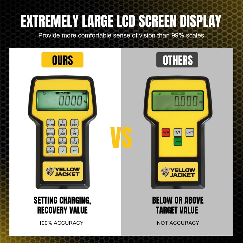 - LCD Screen: Refrigerant charging weight scale with a LCD screen and 110° bracket is convenient to read even in dark conditions and free your hands lay it on the ground. .Four-button control panel is simple to use for everyone.YELLOW JACKET refrigerant scale can bring you accurate measurements every time