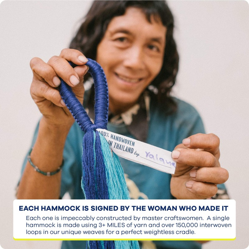 In 2011, our co-founder (a lifelong hammock enthusiast) discovered a ridiculously comfy hammock on a remote island. Inspired, he set out on a journey to spread blissful relaxation around the world. The women who weave Yellow Leaf Hammocks by hand are master artisans. By selling their hammocks globally, they’ve been able to transform their lives, families and communities forever. At Yellow Leaf, we believe two things: (1) the world would be a better place if everyone spent 15 minutes relaxing in a hammock every day; and (2) global poverty will end faster if we can create sustainable jobs for moms in rural communities. Our hammocks are much more than outdoor decor. Each Yellow Leaf Hammock and Hanging Chair is signed by the woman who made it. That’s not just because we want you to feel connected to the origins of your hammock; it’s because Yellow Leaf weavers take pride and feel empowered by their work. Try our hammocks. We want to hear what you think and we want you to join our mission to make the world a better place (from the comfort of a hammock).