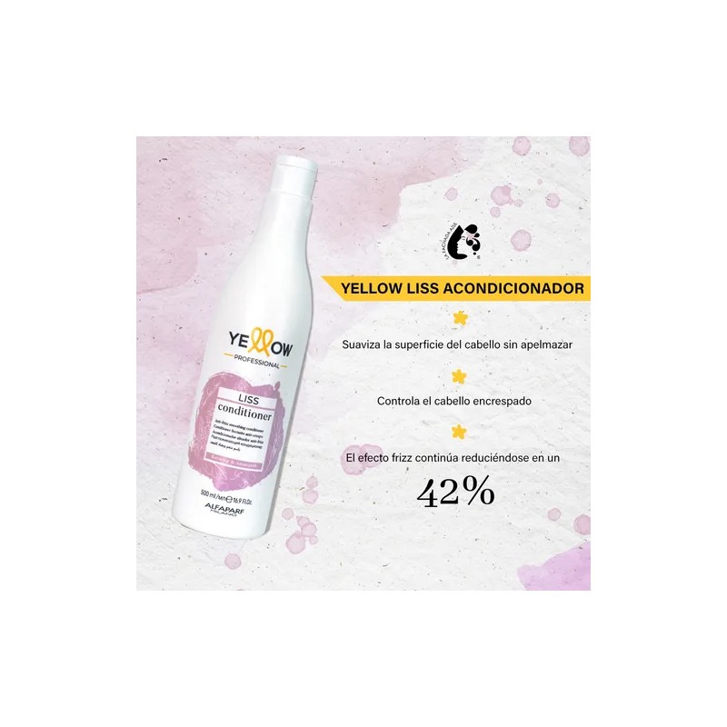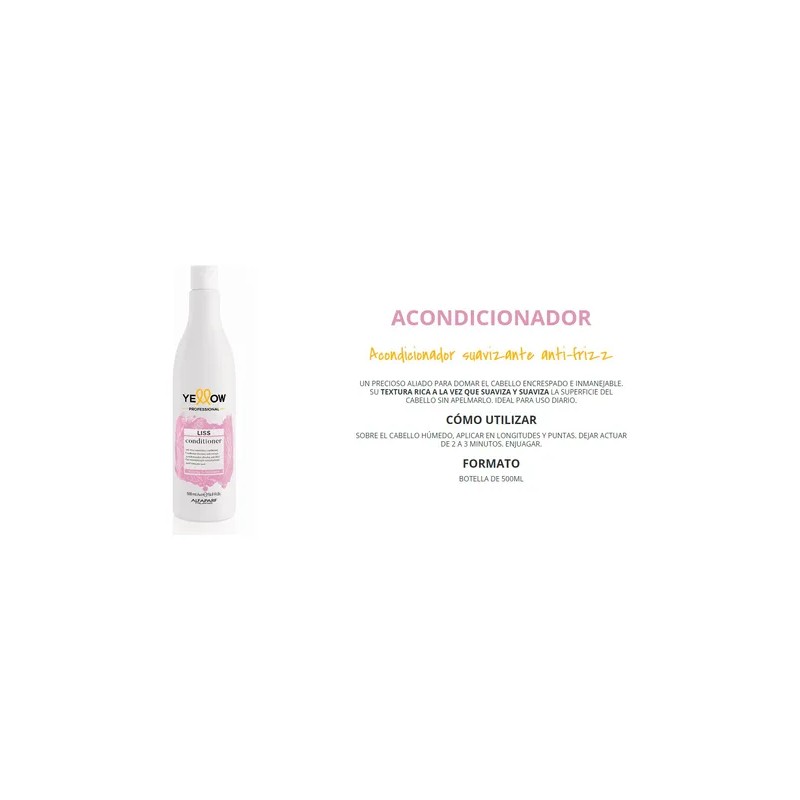 * Acondicionador Yellow Liss anti-frizz para liso perfecto, un precioso aliado para controlar el cabello encrespado y fuera de control. Suaviza sin apelmazar. Indicado para uso diario. Presentación Frasco 500 ml
