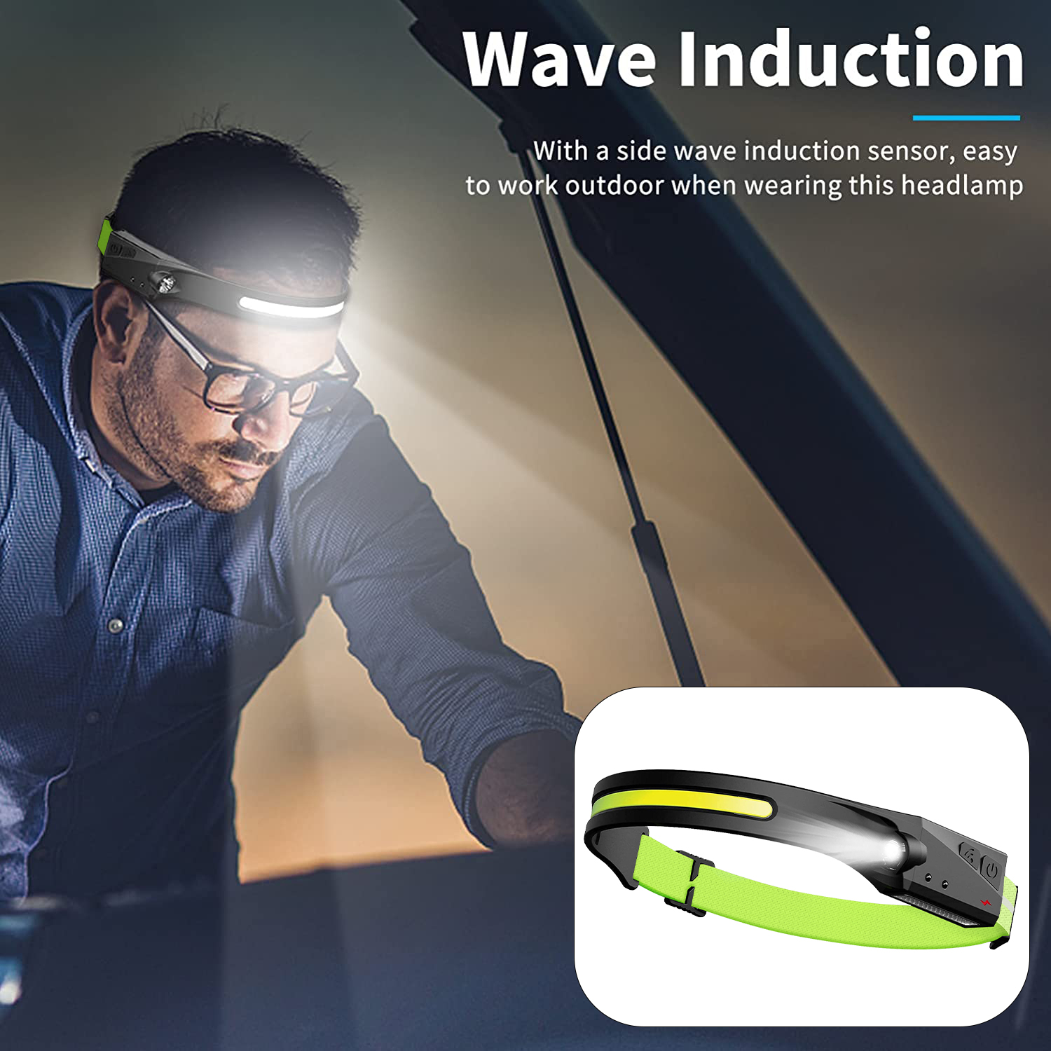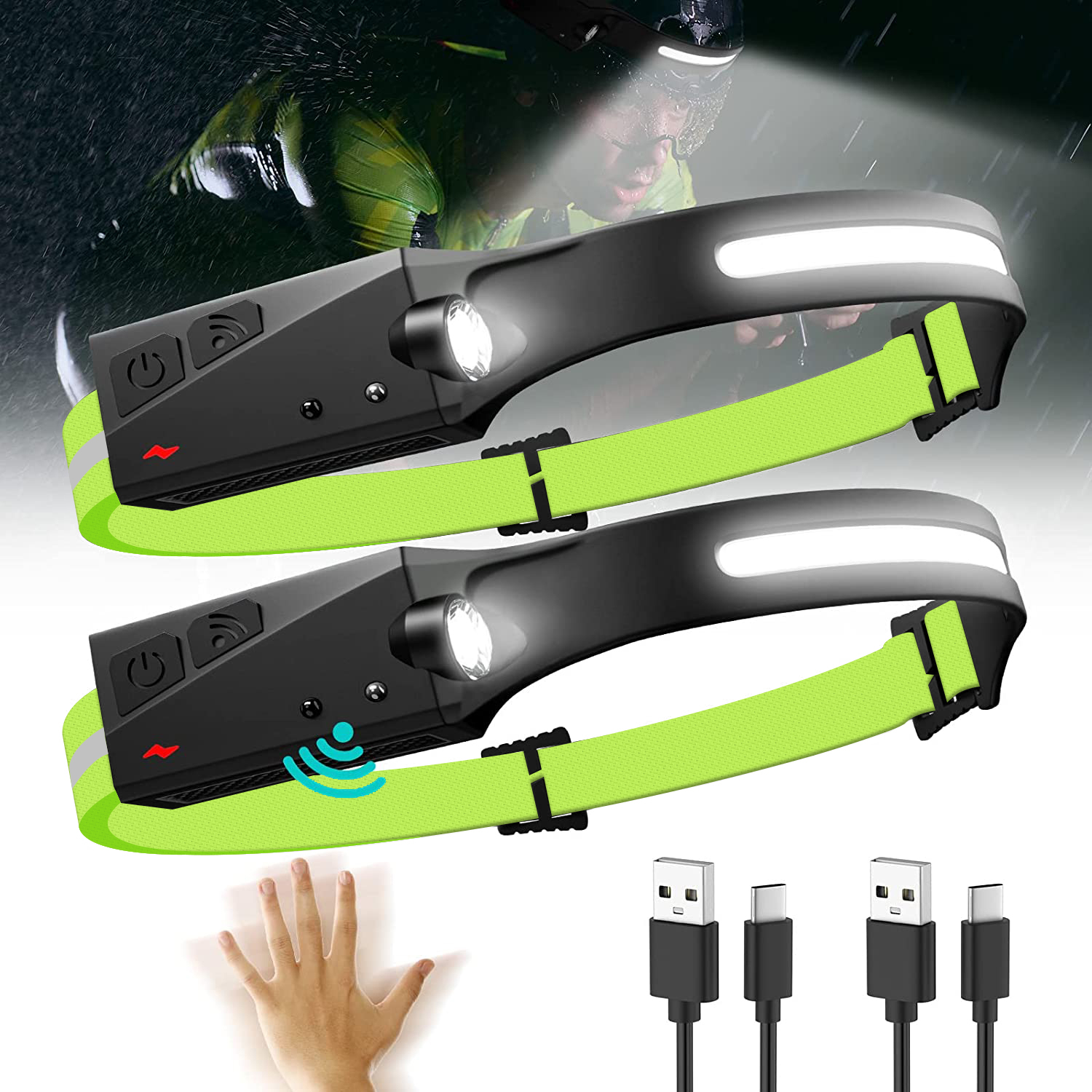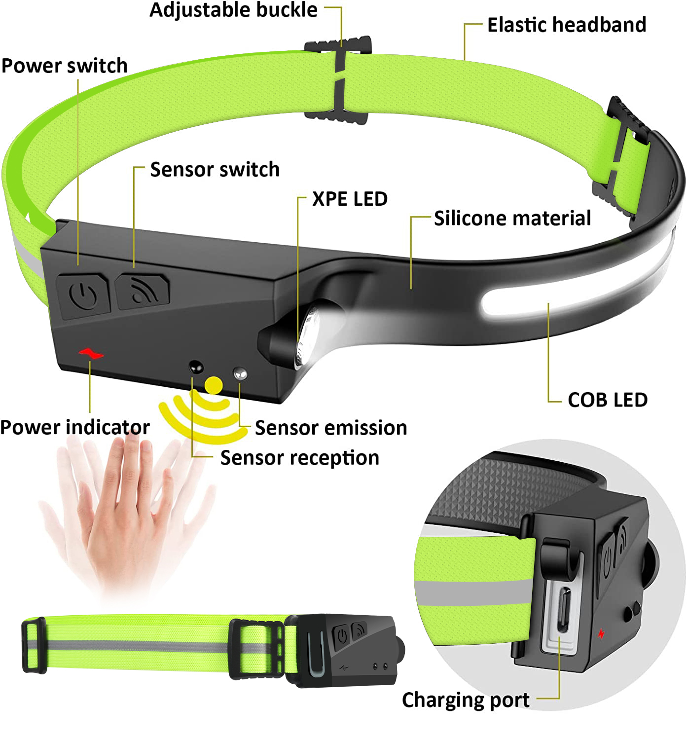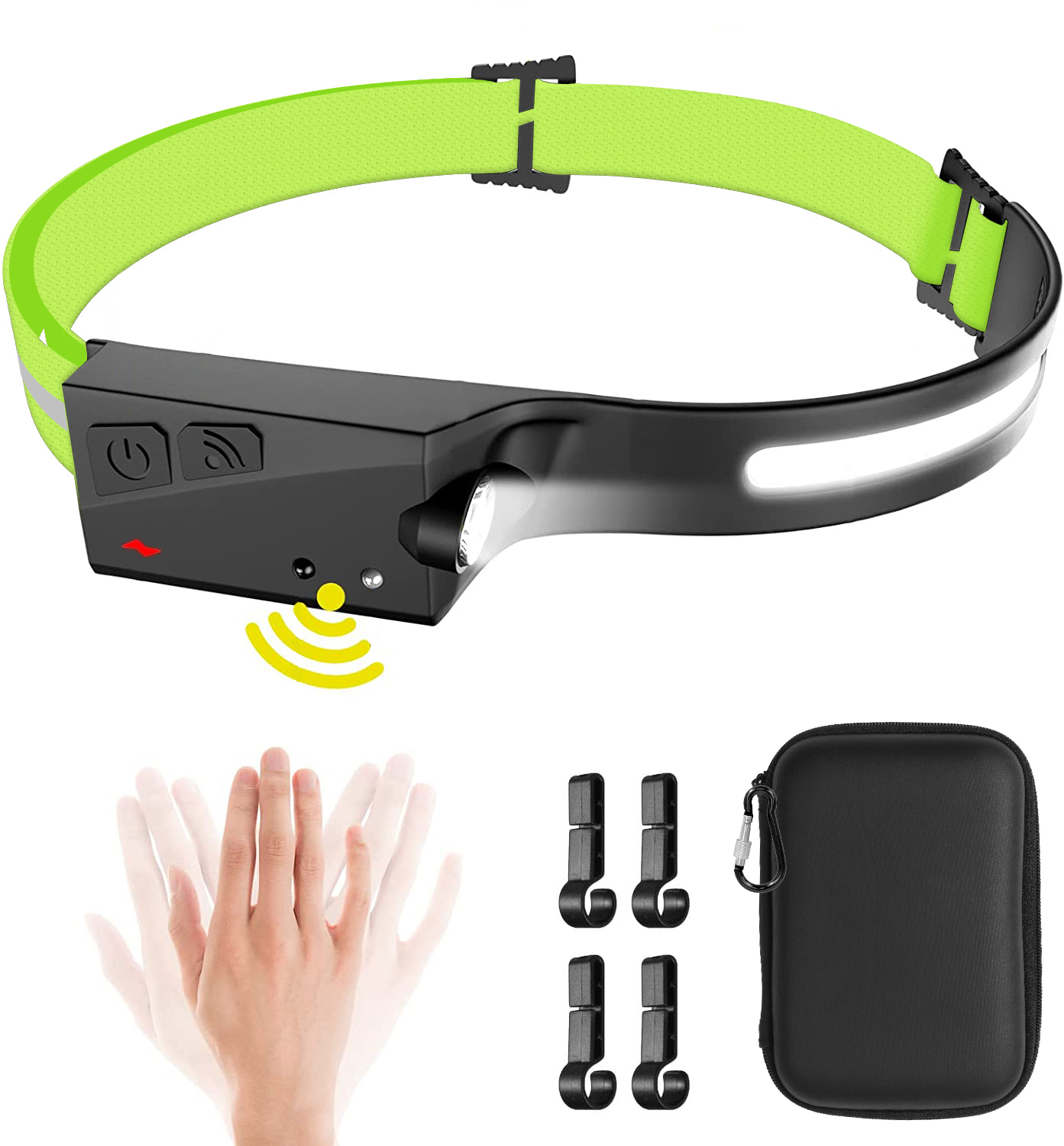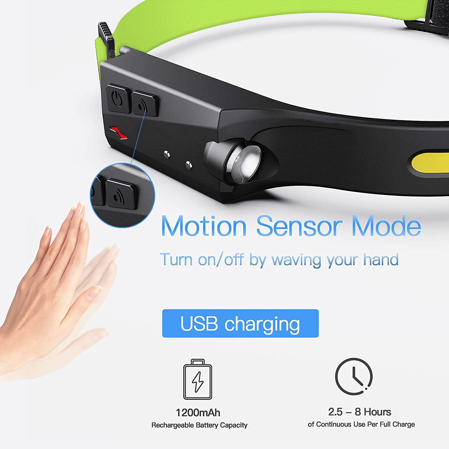 • Motion Sensor - LED head lamp has a high-quality motion sensor battery. When the sensor function switch is turned on(Indicator light will turn red to yellow), you can turn on/off the light by just waving your hand within the sensor function range.