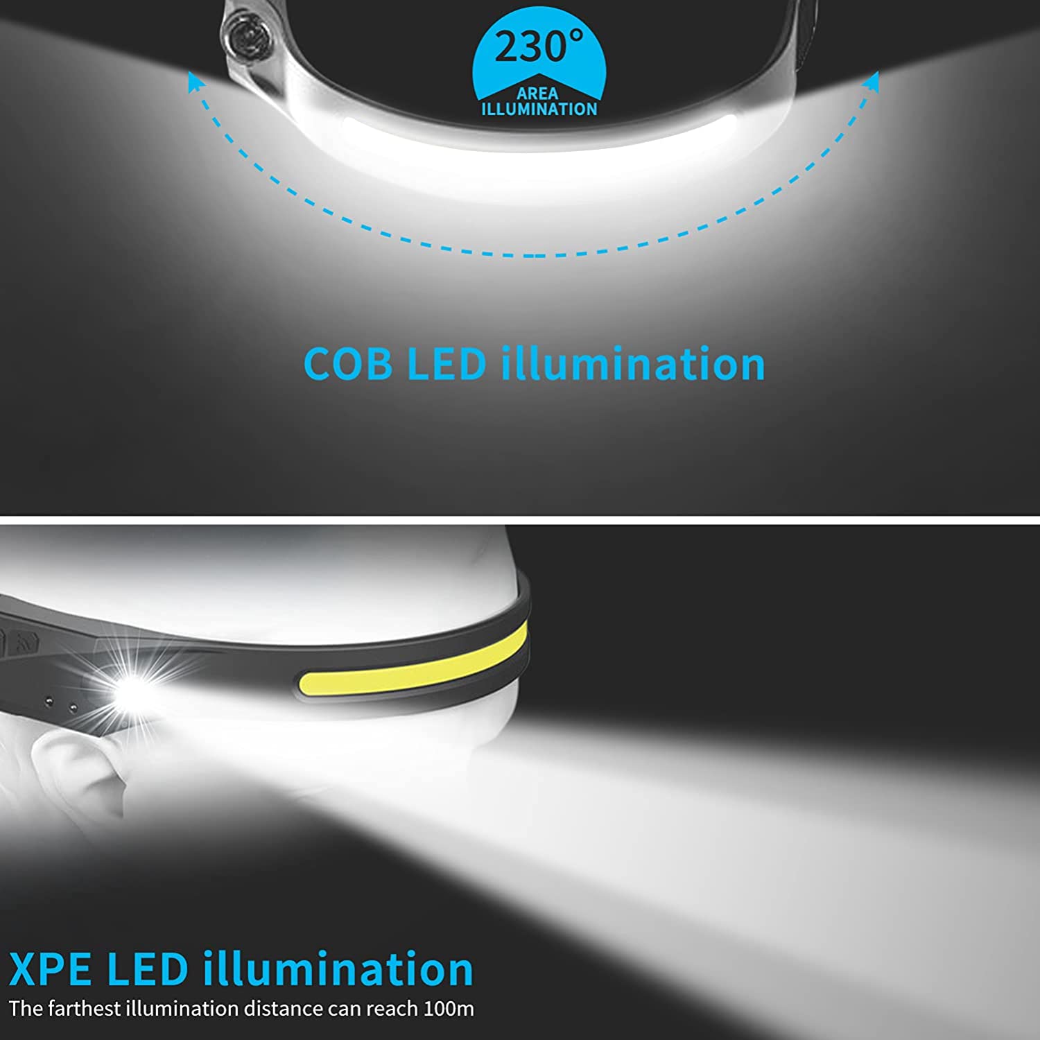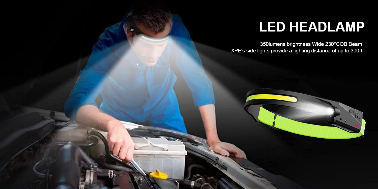 • SUPER BRIGHT & WIDE 230°COB BEAM - LED Headlamp with 4.7inch super bright COB wide beam, offers maximum 230°wide-angle illumination, 350lumens brightness.The wide beam headlights provide a very wide field of view, allowing you to shine without moving your head.
