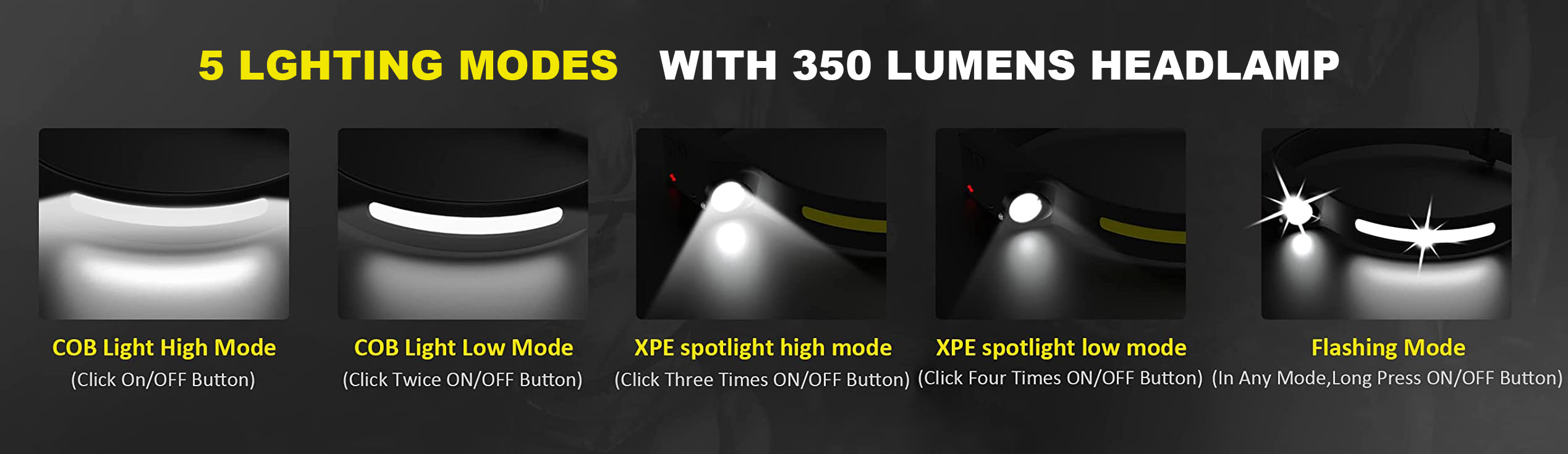 • 5 Types of Lights: The headlamp have 5 light modes - COB high brightness (100%) / COB low brightness (40%) / XPE side light high brightness (100%) / XPE side light low brightness (40 %)/SOS Flash mode, lightly press the power button to switch the first four modes, in any light mode, long press the power button to enter the flash mode.