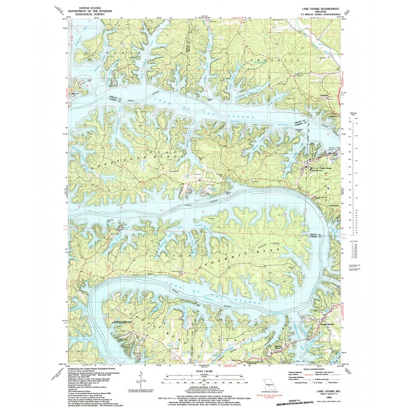 YellowMaps Lake Ozark MO topo map, 1:24000 Scale, 7.5 X 7.5 Minute, Historical, 1983, Updated 1989, 26.9 x 21.9 in - Tyvek