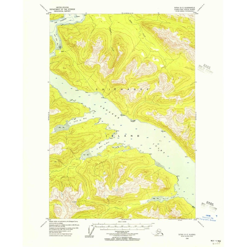 YellowMaps Sitka D 5 AK topo map, 1:63360 Scale, 15 X 15 Minute, Historical, 1948, Updated 1956, 20.9 x 17 in - Polypropylene