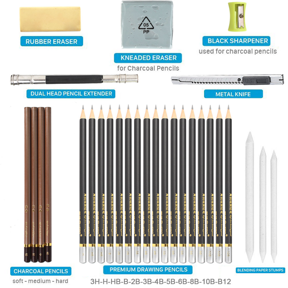 • JUMBO VALUE 29 PACK – All IN ONE ART SET - 17 sketch pencils (ranging from 4H to 12B), 4 charcoal pencils(2xsoft, 1xneutral, 1xhard), 3 paper pens, 1 utility knife, 2 erasers, 1 pencil extender and 1 pencil wrap