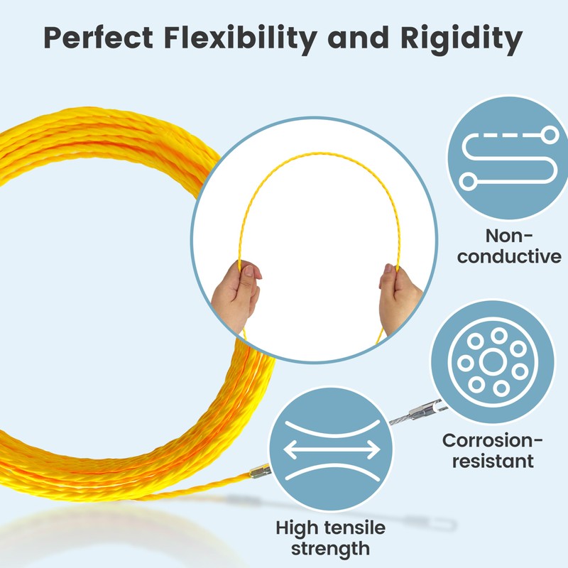 - DIMENSIONS & CONSTRUCTION: Fishing tape measures 50/100 feet in length and 4mm in diameter. Crafted from rust-resistant PET material, cable fishing tools is lightweight, highly durable, and boasts a strong resistance to breakage