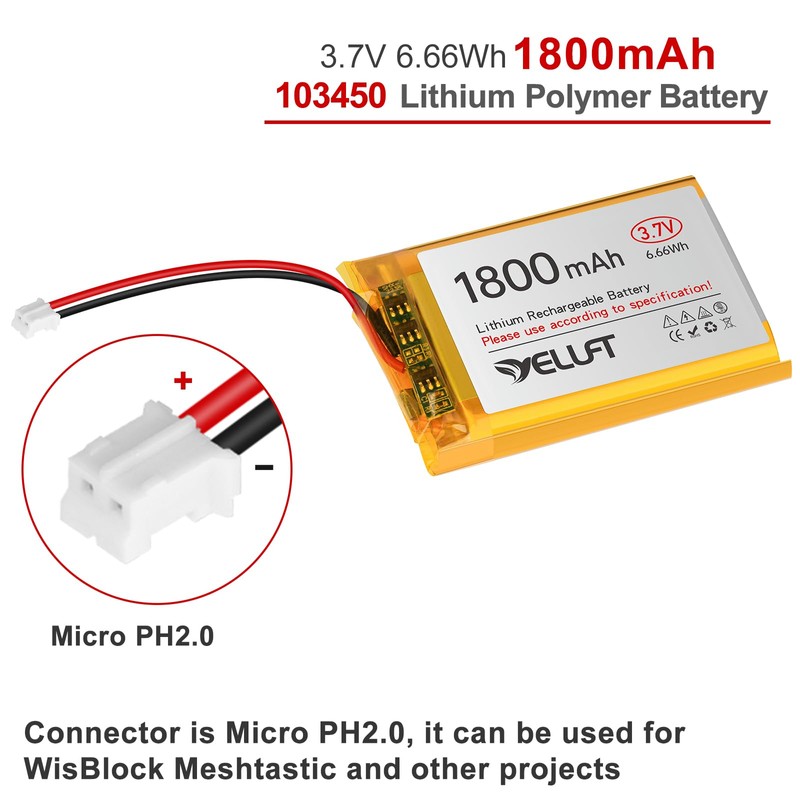 • Widely Application: With Micro PH2.0 plug, these 1800mAh LiPo battery can be used for RAK19007+RAK4631, ESP32 development board and Other low-power IoT/DIY electronics requiring compact power solutions