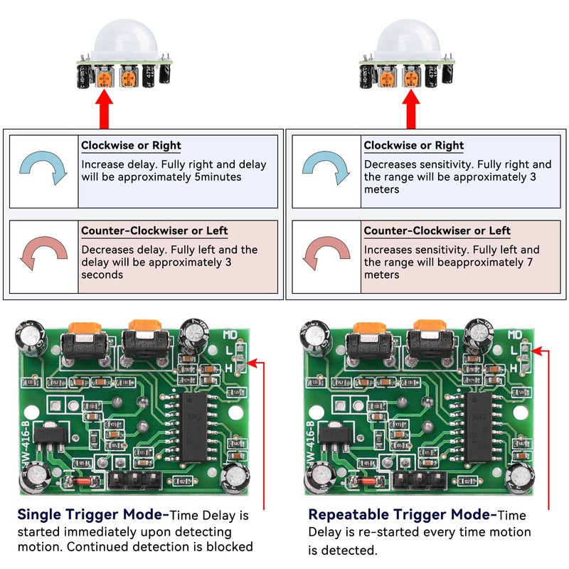 - Adjustable Sensing Distance and Sensing Delay: Rotate the distance potentiometer clockwise to increase the sensing distance (about 7 meters), otherwise, the sensing distance decreases (about 3 meters); rotate the delay potentiometer clockwise to increase the sensing delay (about 300S), otherwise, the sensing delay decreases (about 0.5S)
