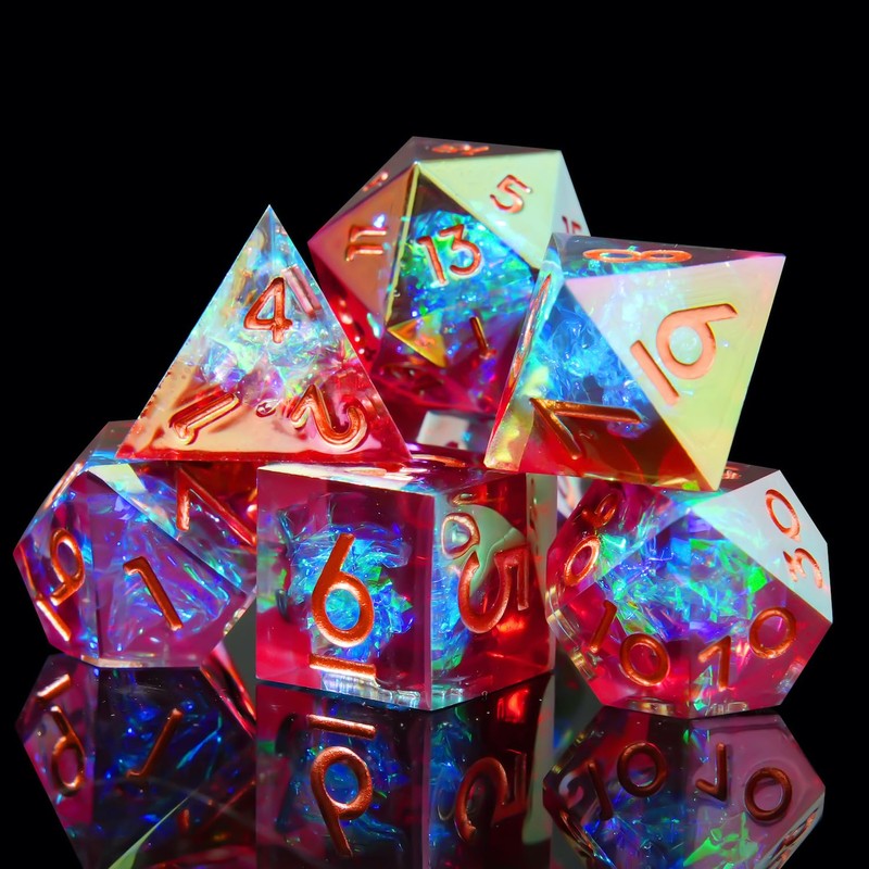 YEMEKO Laser DND Rainbow Dice Set Dungeons and Dragons Dice with Iridescent Iconic Coating, Polyhedral Dice with Resin Sharp Edge for RPG, MTG Table Games (red Sunset)
