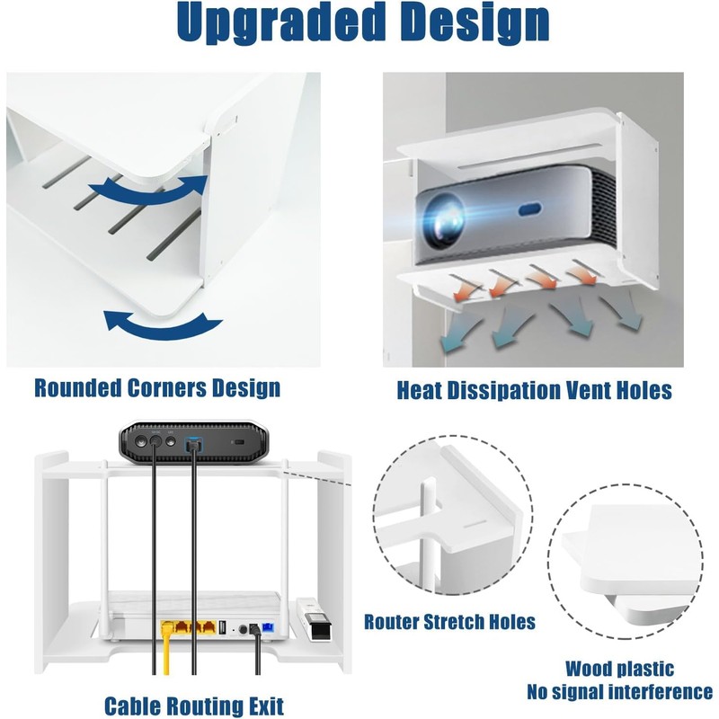 - Heat Dissipation & No Signal Interference: Wall mount with vents increase heat dissipation for projector / WiFi router / modem to obtain better performance and lifespan. Projector holder is made of wood plastic. No signal interference.