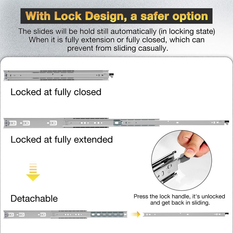 - 【With hold-still lock & Detachable】There is a black handle to lock and unlock.When it is fully extension or fully closed,the slides will be hold still automatically (in locking state),which can prevent from sliding casually and keep your drawer stable and safe.Press the lock handle gently,it's unlocked and get back in free sliding; Detachable: By press-and-hold the lock handle,and pull outward in the meantime ,the 3rd track(the narrowest section) can be separated ,easy to installl.