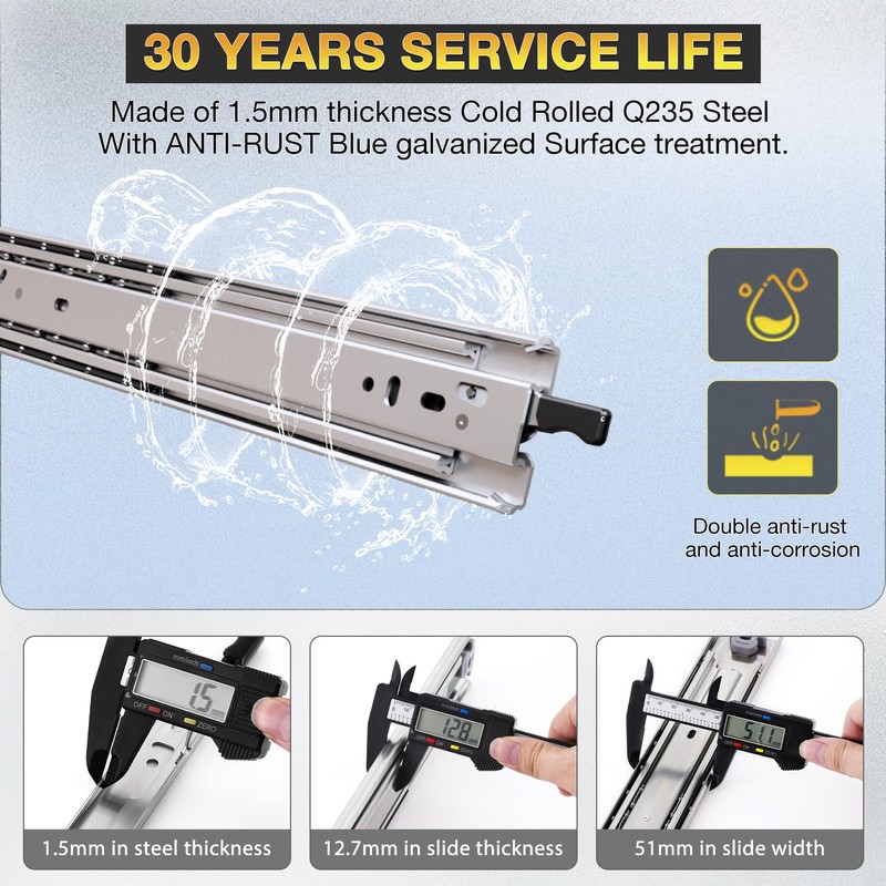 - 【Anti-rust & Smooth work 】The anti-rust ability and oxidation resistance of our slides is superior to the others because of the special galvanized blue sealing surface treatment; With dual industrial grade bearing ball inside,the drawers slide smoothly even though carrying heavy items; With a rubber crash pad on,which is a wear-resisting and impact-resistant device,the drawers can slide quietly without collision noise.