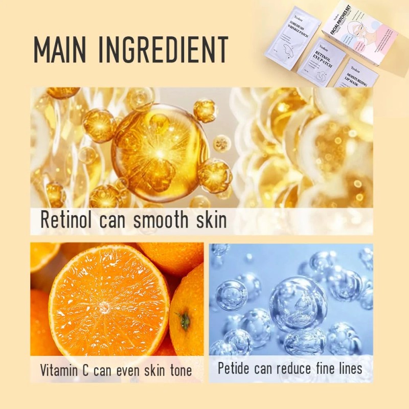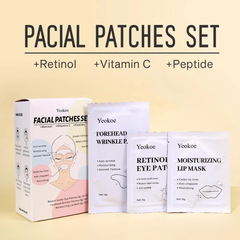 - Independent packaging: The facial patches set includes 10 pairs of retinol eye masks, 10 lip masks, and 10 forehead patches, each of which is individually packaged to ensure that it will not be contaminated and can be easily carried when traveling