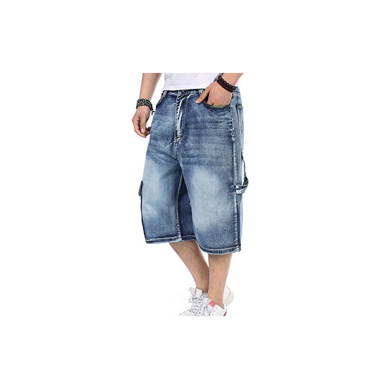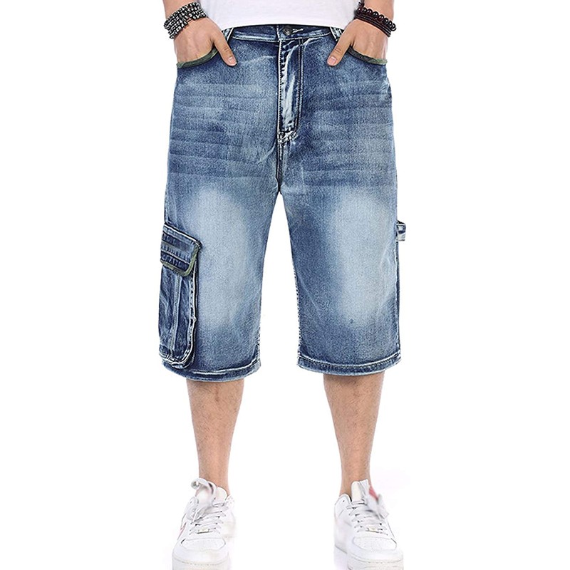 Yeokou Men's Loose Hip Hop Cropped Jeans Work Denim Shorts with Cargo Pockets (34, Light Blue)