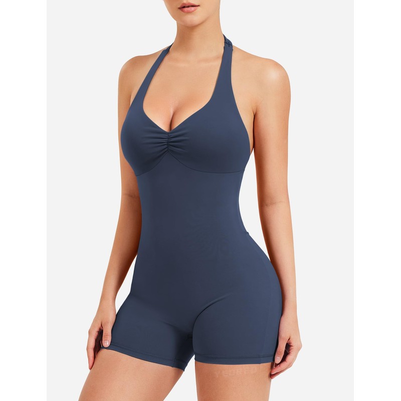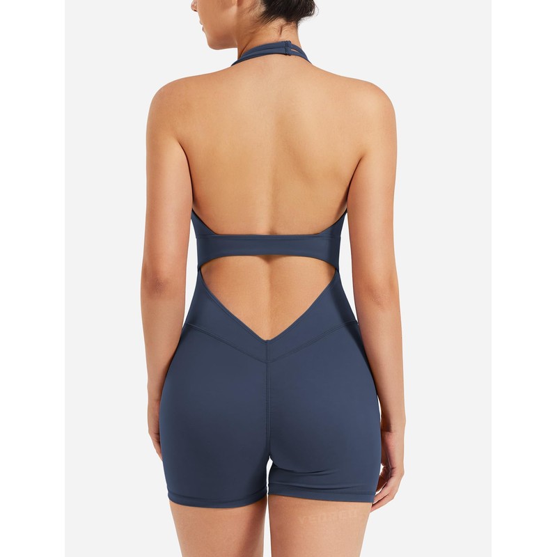 YEOREO Women Halter Workout Jumpsuits One Piece Backless Bodycon Bodysuits Hidden Scrunch V Back Yoga Joceline Short Romper
