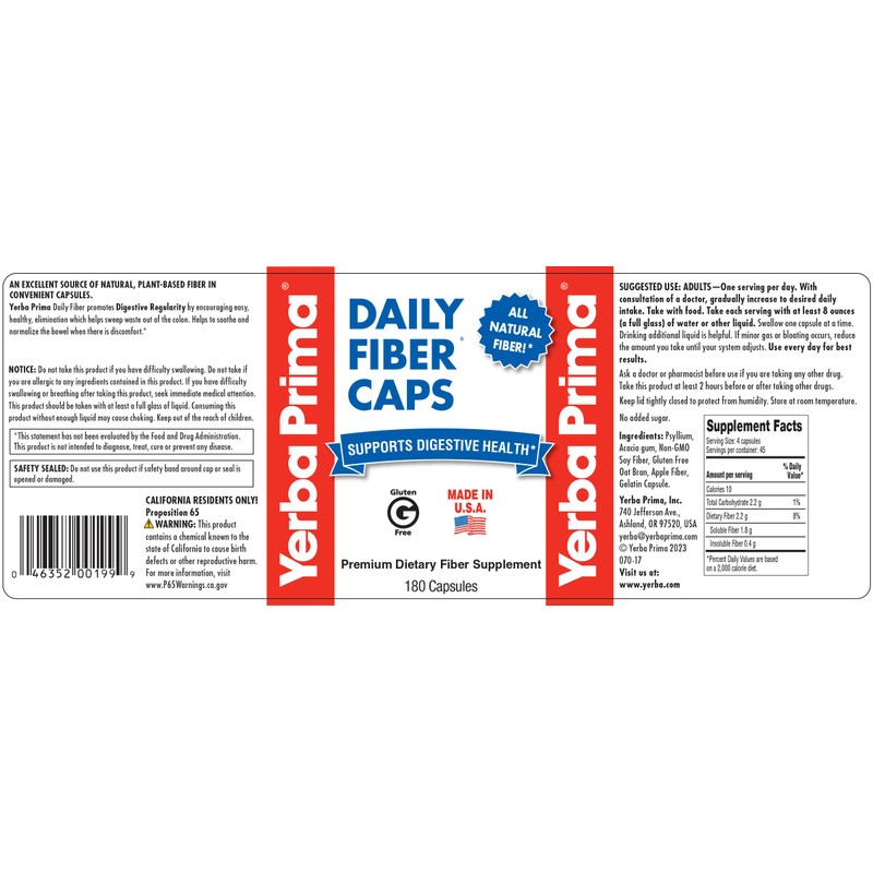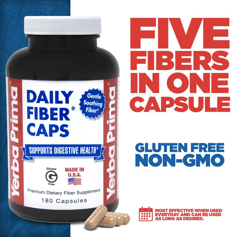 Yerba Prima Yerba Prima Daily Fiber Capsules, 180 Caps (Pack of 3) - Soluble Dietary Fiber Supplement - Colon Cleanse - Gut Health - Constipation Relief, Vegan, Non-GMO, Gluten-Free
