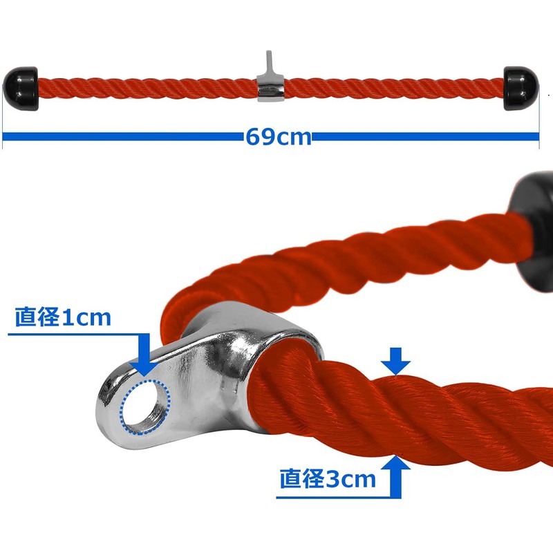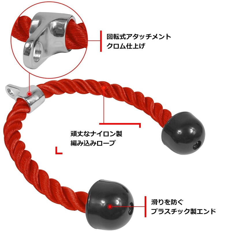 - 「丈夫なデザイン」トライセップロープには、クロームメッキされた頑丈なアタッチメントが付属しており、標準的なウェイトスタックケーブルシステムに取り付けて、プレスダウン、カール、キックバック、三角筋の引き上げなどのマルチワークアウトが可能です。