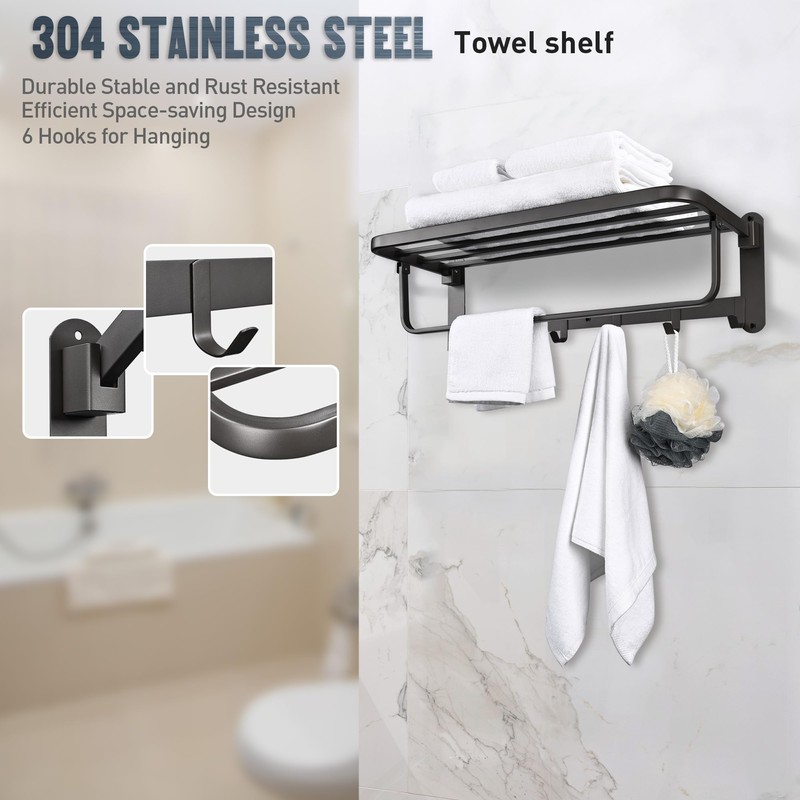 Yescom Foldable Towel Rack with Towel Bar and 6 Hooks for Bathroom 23" Wall Mounted Towel Rack 2 Tier Rail Storage Stainless Steel Shelf Dark Grey