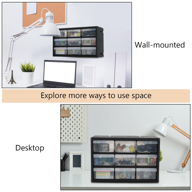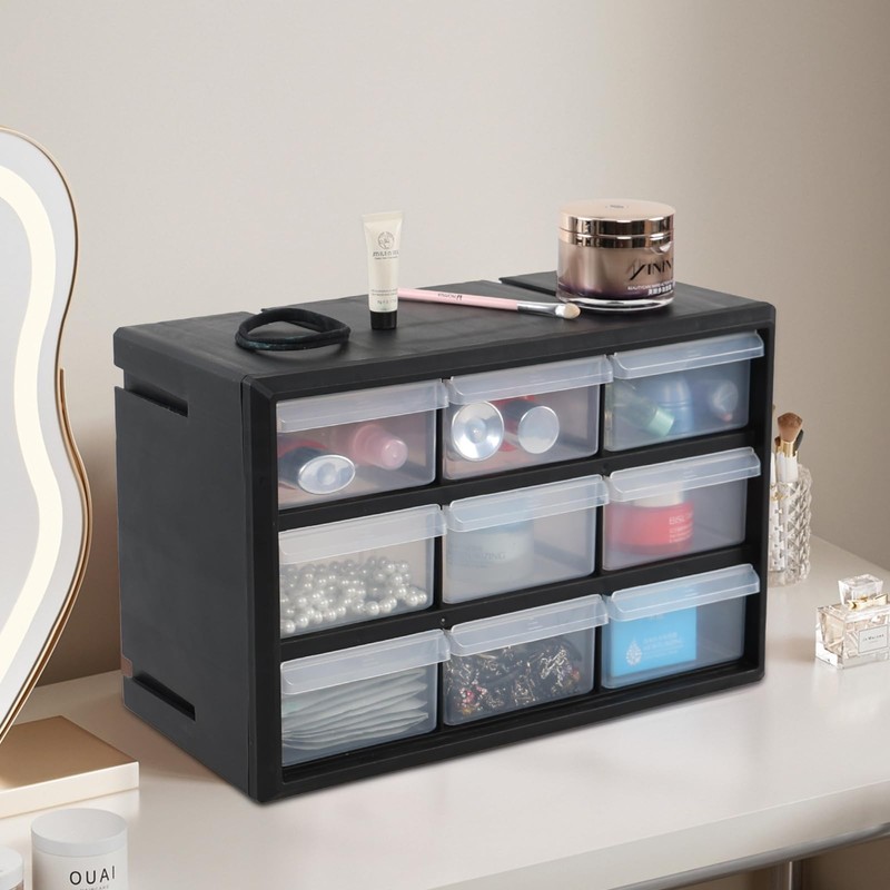 The 9-drawer small storage cabinet is made of high-impact plastic, have a sturdy construction designed for long-lasting organization. Invest in a small parts organizer that lasts to maintain a clutter-free space. Great for garages and workshops for both homeowners and businesses; The plastic storage drawers can be used as tool box, screw organizer or for battery storage; Keep nails and other small parts accessible. This plastic storage cabinet offers many uses around the home; It can be a lego storage organizer, craft organizer, or sticker organizer; Use it for makeup storage and organization or for medicine and first aid supplies. Stack and connect your multi compartment storage boxes to match your space. You can also mount your workshop storage drawers to the wall to stay neat.