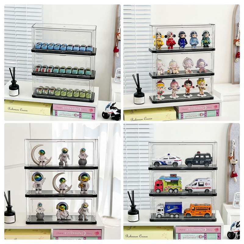 Multifunctional desk organizer, perfect for storing collectibles, action figures, pop figures, small doll, mini toys, model cars, stone, shell, specimens, coin and medal under 3.5 inches tall.