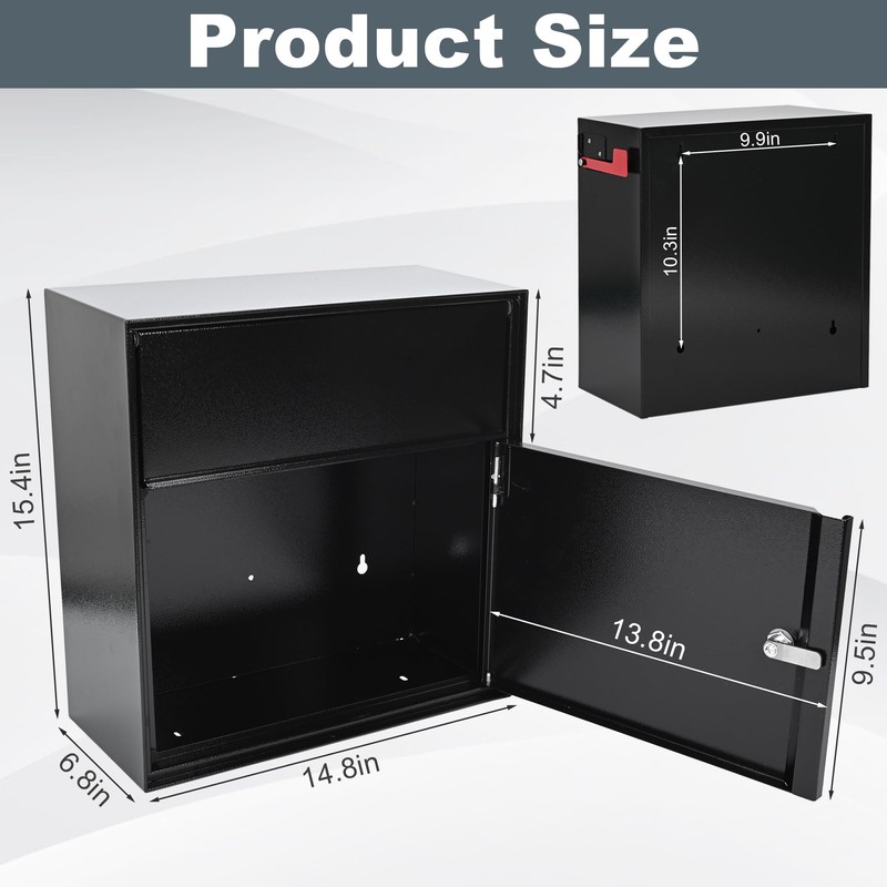 yeshine Large Capacity Wall Mounted Locking Mailbox with Mail Flag and Number Stickers, Steel Mail Drop Box with Key Lock, Security Mail Boxes for House and Outside, Black, 14.76" x 6.89" x 15.35"