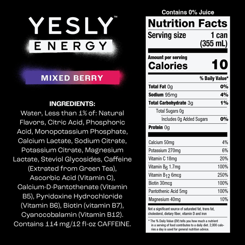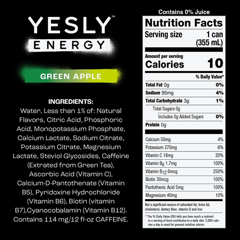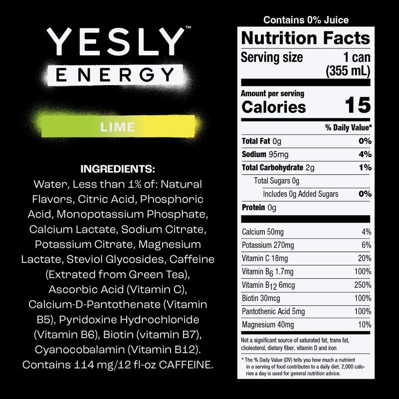 - LOW CALORIE AND VITAMIN ENHANCED: At only 15 calories a can, Yesly Energy is enriched with energizing Vitamin C, B12 and B6, providing re-vitalizing support to keep you in motion.