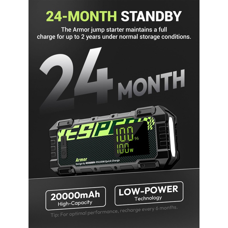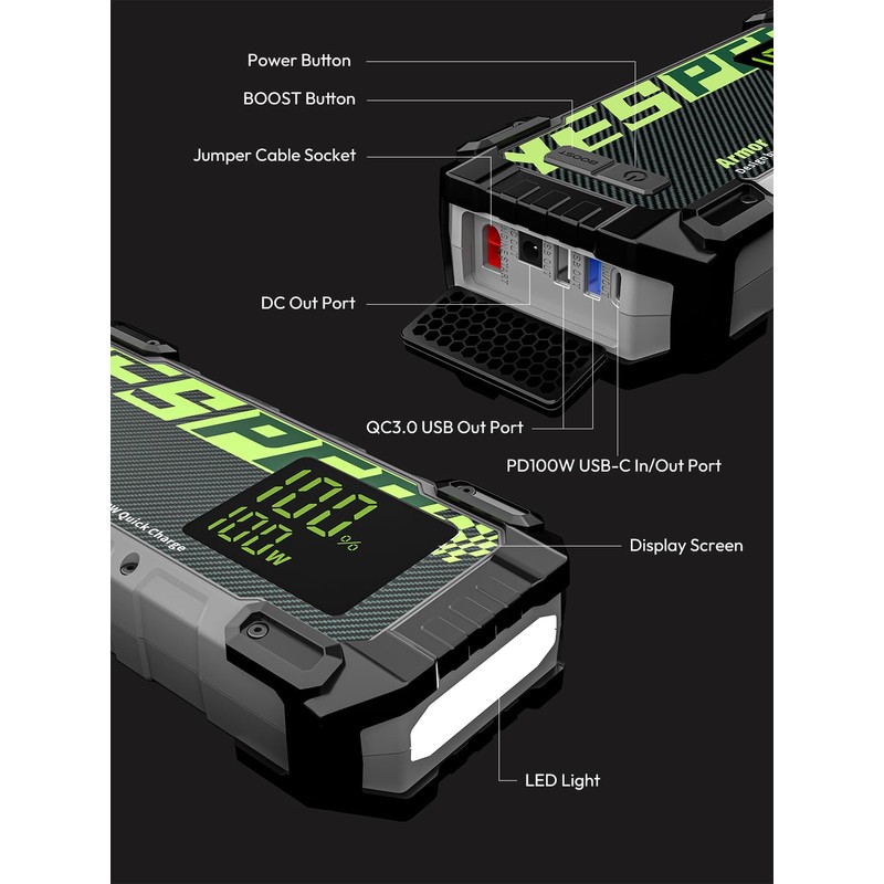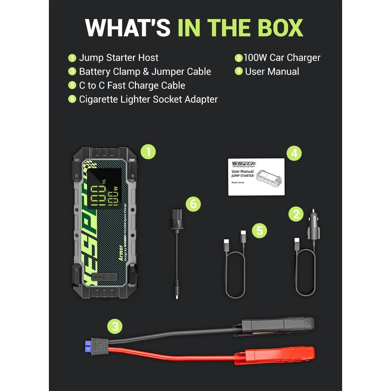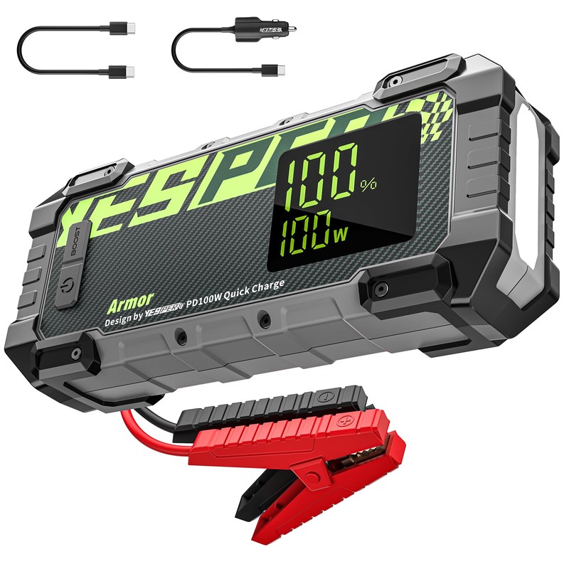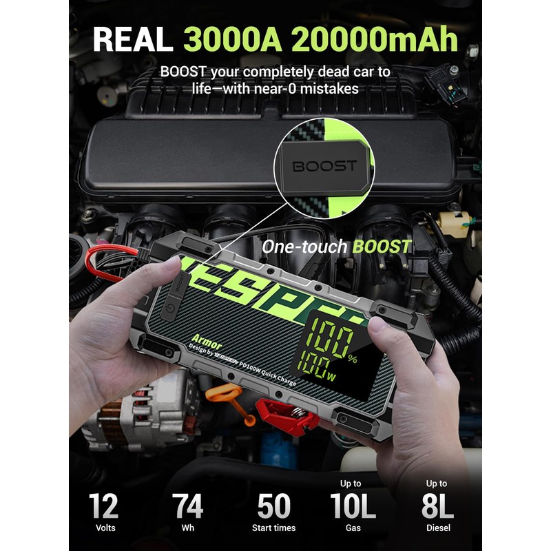 - Powerful car starter- YESPER Armor car jump starter is the ultimate solution for starting completely dead cars, with a 3000 amps peak cranking power. Suitable for 12V vehicles up to 10LGas/8L Diesel engines