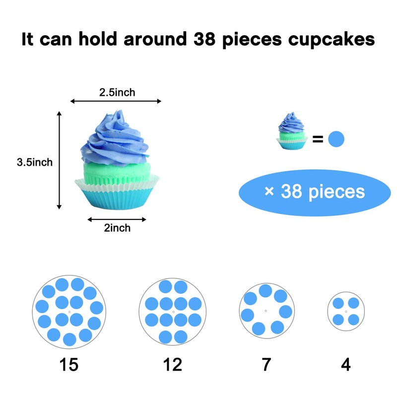 - IMPRESSIVE DETAILS: The acrylic rods of the cupcake tower display have embedded cupper nut in the middle in order to keep the stand straight and stable. The cupcakes stand is extra large and can hold up to 52 cupcakes of 2.5” diameter or the equivalent of 12 lb. of food.