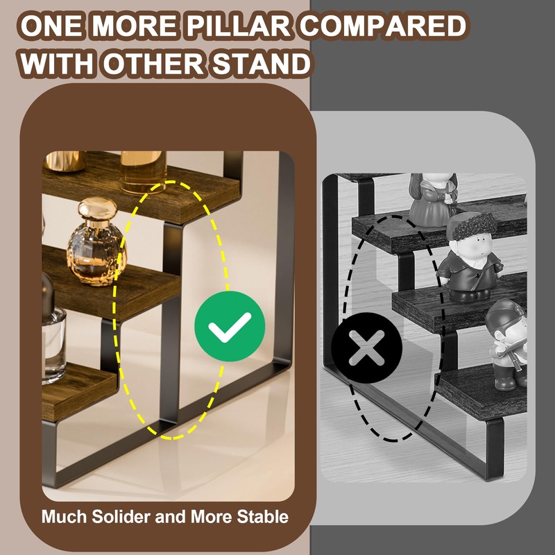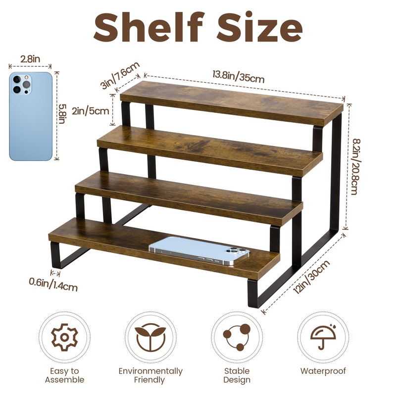 - Unique Design:This 4 tiered diplay stand is made by rustic MDF wood and black matte-finised metal, which offers a chic, distinctive presentation for your home.The stepped design creat easy visibility and access to all your items easily,The simple and elegant apperance is suitable for various areas to save space.The raised tiers help to create an eye-catching feature for your items