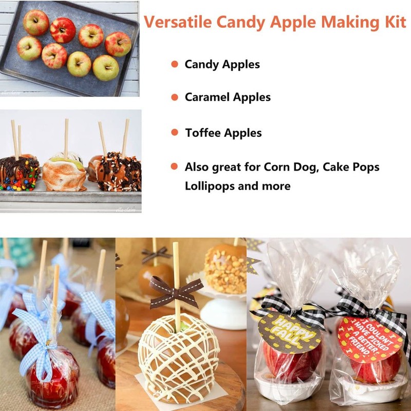 Product Features:Make tasting and aesthetically pleasing Candy Apples with this DIY Candy Apple Kit. Each package has 100 pcs of candy apple sticks,100 pcs of clear OPP bags for better display, and two rolls of 25-yard glitter ribbons, in Gold and Silver. Perfect for making and decorating your candy apples/caramel apples.These candy apple sticks are extra thick and heavy-duty, measuring 0.2in/5mm in Diameter, 5.5in/14cm in length. Perfect for candy and caramel apples, corn dogs, Cake Pops, Kebab, Lollipops, and any other food-on-a-stickGreat for any occasions, parties, events, food catering, or for any home use purposes. Also great for fairs and other fundraising events.Pakcage Includes:Candy Apple stick 100Clear Wrapping bag 100Glitter Ribbons 50 yds in total