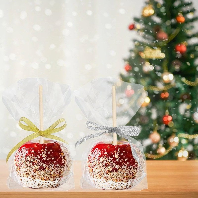 - Glitter Ribbons: Our ribbons are made of high-quality polyester. The length of each ribbon is 25 yards, width is 0.4 inches, perfect for decorating gift box. Candy clear wrapping bags: The clear bags are made of food-grade opp material for better showcase your candy apples, measured 6.7" 7.9" in big enough for most apple sizes