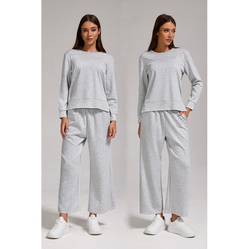 YETOWA Women’s Air Layer Fabric 2 Piece Set Stylish Long Sleeve Top & Wide Leg 3/4 Pants Lounge Matching Tracksuit