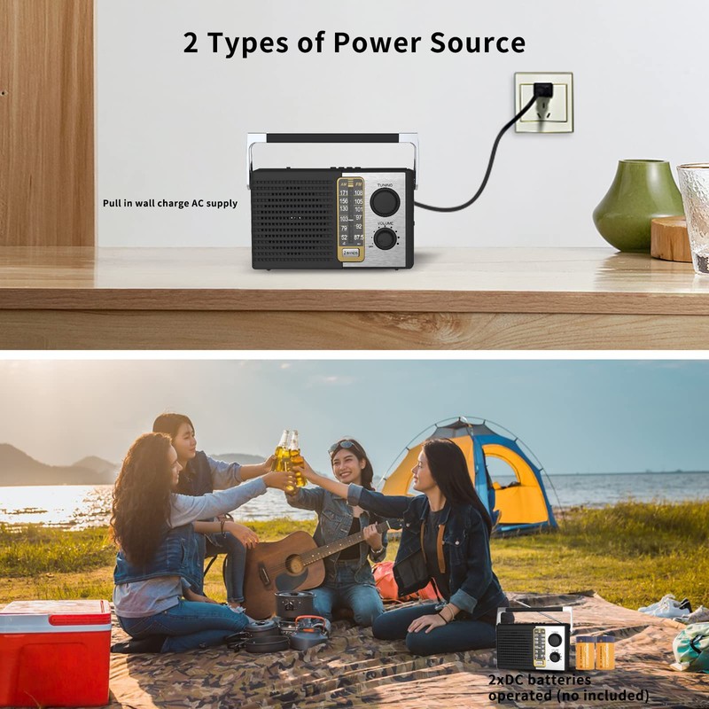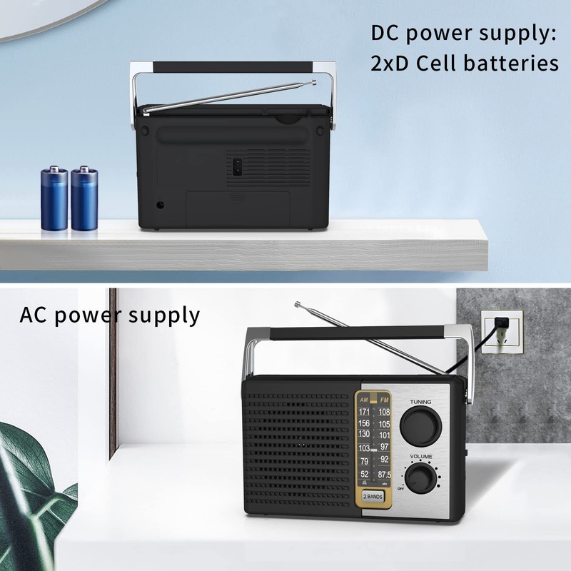 - 2 Charging Ways for Small Radio: This transistor radio is designed for two charging ways. While you are indoors, the AC power for you to plug the charging cable(include) in the wall to listen to the radio the whole day. If In the yard or outdoor, inserts 2 D Cell batteries(not included) in the battery-operated radio so that you can continue to connect and get broadcast news in real-time