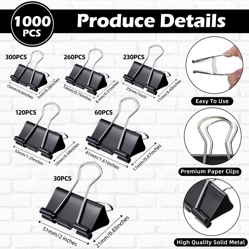 - Generous Package: You will receive 1000 pieces of long tail clips in different sizes, 2 inches x 30 pieces, 1.6 inches x 60 pieces, 1.25 inch x 120 pieces, 1 inch x 230 pieces, 0.75 inch x 260 pieces, 0.6 inch x 300 pcs, binders of various sizes can meet your different use needs, and you can also share it with your friends to bring them convenience