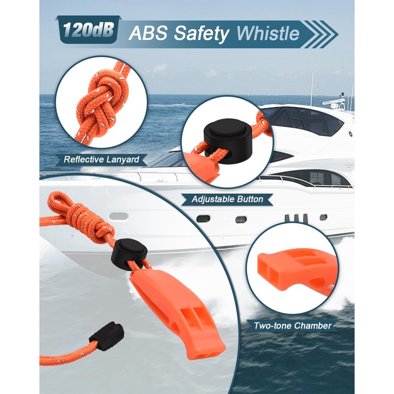 - 120dB Survival Emergency Whistle & Reflective Lanyard: The pealess dual-chamber whistle produces ear-piercing 120dB alerts (louder than a chainsaw!) audible over 1 mile away. Adjustable neon lanyard with reflective strips ensures visibility in darkness; easily clips to life jackets, kayak PFDs, or backpacks.