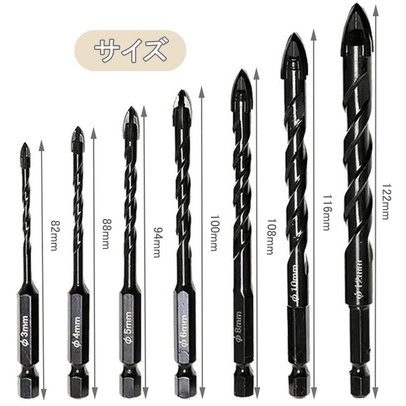 - Set Contents: 7 drill bits. 7 sizes available: 3mm, 4mm, 5mm, 6mm, 8mm, 10mm, 12mm