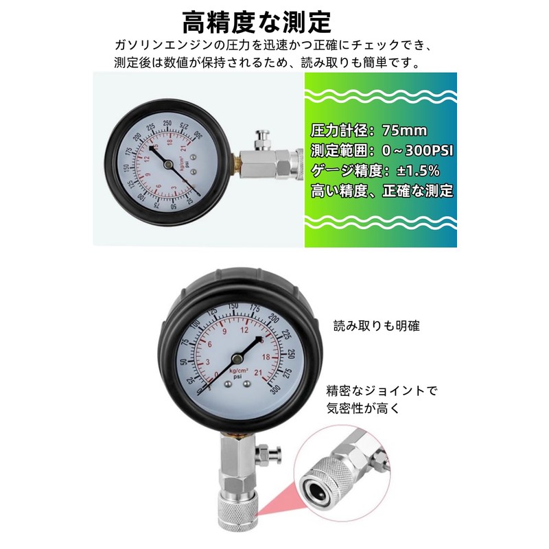 • (Precision measurement) Gauge accuracy: ±1.5%. You can check the pressure of the gas engine quickly and accurately, and the numbers are retained after measurement for easy reading
