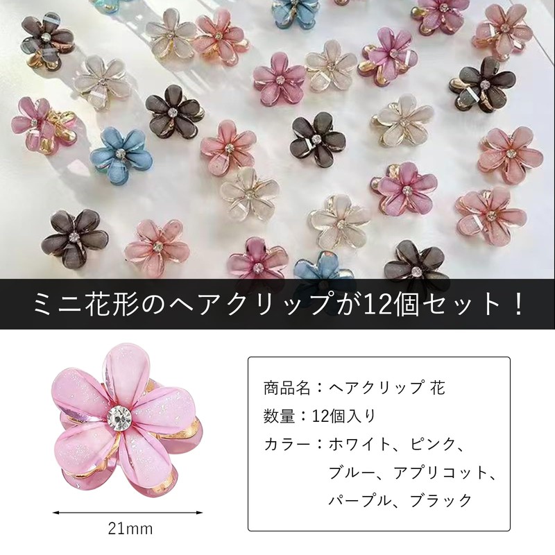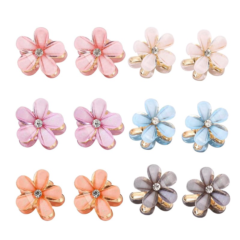 - Package Contents: 1 set of 12 flower motif mini hair clips; Size: Approx. 0.8 x 0.8 inches (2 x 2 cm). Available in 6 gentle colors: white, pink, blue, apricot, purple, and black. Cute shape, compact and practical