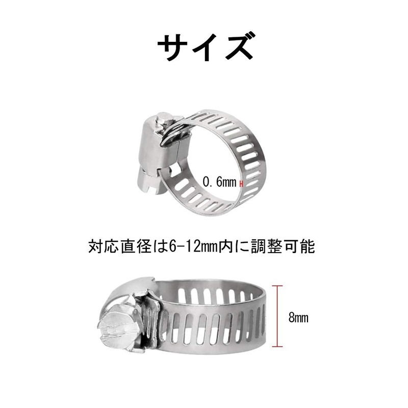 - Package:10pcs 6-12mm hose clamps Size: Suitable hose outer diameter: 0.2 - 0.5 inches (6 - 12 mm); Band width: 0.3 inches (8 mm); Thickness: 0.02 inches (0.6
