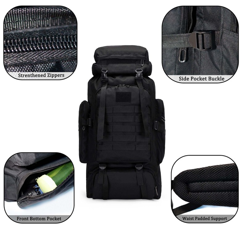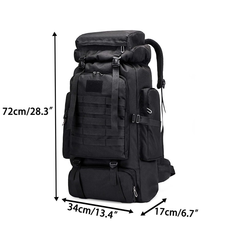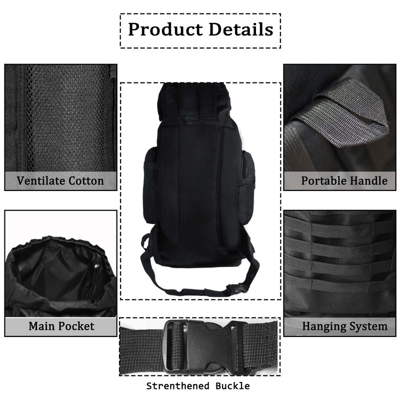 - Large Space and Capacity --- This military tactical backpack measures 36*16*12 inches(L x W x H), and 3.0Ibs weight. The main storage bag is large enough to load your necessary tools, such as sleeping bag, mat, hammock or shoes and luggage, the elastic drawstrings can keep your bag tight. Except that, there are extra a laptop compartment, a front zipper pocket and two side pockets. The 2 side pockets can contain bottles, umbrellas and other neccesorry tools.