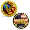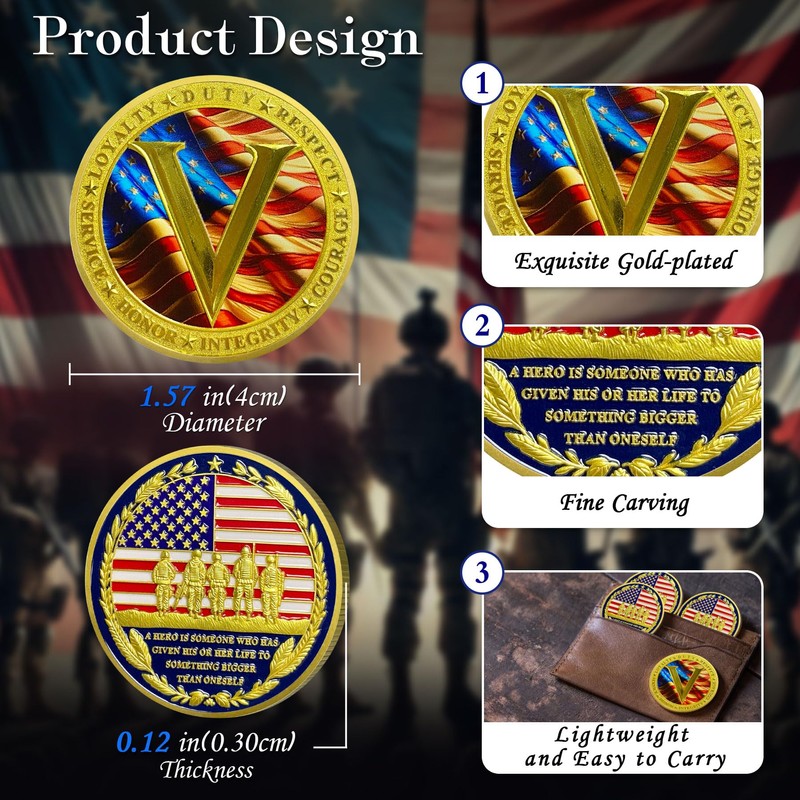 - Craftsmanship & Quality: Crafted from prime quality zinc alloy with a stunning gold finish, this veteran coin boasts detailed engravings and vibrant colors. The front side features the "V" emblem with the American flag, surrounded by key military values, including loyalty and integrity. The reverse side depicts a group of soldiers standing before the American flag, accompanied by a quote recognizing the ultimate sacrifice veterans make for their country.